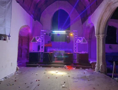 Hundreds of revellers attended the party at All Saints Church in East Horndon, near Brentwood, after the building was broken into.
