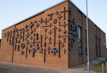 One of the walls at St Rollox Church in Sighthill has been adorned with 77 crosses fashioned out of concrete.