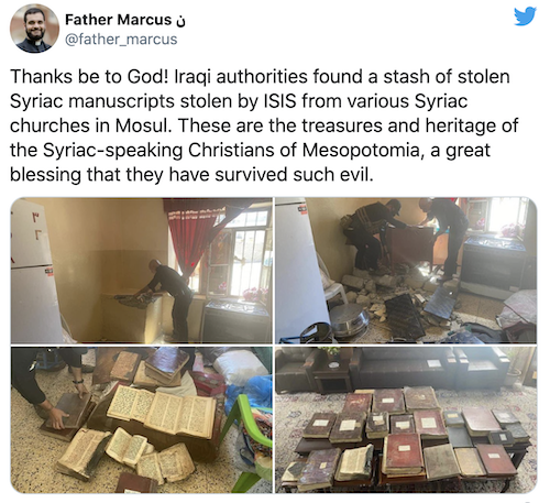 “Thanks be to God! Iraqi authorities found a stash of stolen Syriac manuscripts stolen by ISIS from various Syriac churches in Mosul. These are the treasures and heritage of the Syriac-speaking Christians of Mesopotomia, a great blessing that they have survived such evil”, Chaldean Catholic priest Fr Marcus tweeted.