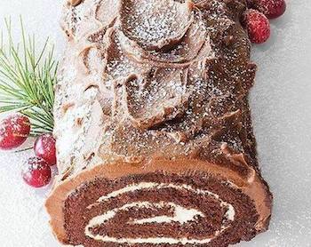 A Yule Log Cake, also known as a Bûche de Noël, is a chocolate sponge cake roll that’s filled with cream and covered with chocolate ganache and made to look like a log. We won’t burn this log; we’ll eat it!