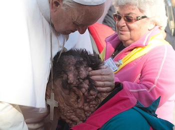 The pontiff embraced Riva while greeting pilgrims in St. Peter’s Square in a vivid gesture of love for people suffering from medical conditions. Francis stopped for several minutes to take Riva into his arms. Moments later, he took him by the face and gave him a blessing.