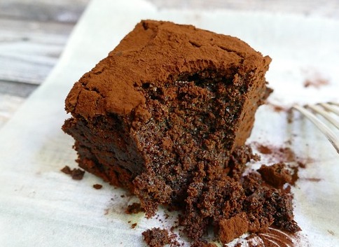 Pour into a baking tray lined with parchment paper. Gently push tiny chunks of dark chocolate evenly into the batter in the tray.