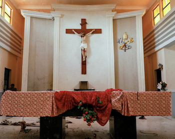Inside the church, streaks of blood on the floors and walls, broken furniture, shards of glass, plaster debris and abandoned shoes testified to the violence of the attack.