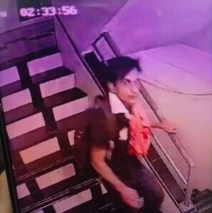 The attacker was spotted in CCTV footage from a stairwell in the actor’s home; wearing a t-shirt and jeans, with an orange scarf on his shoulder.