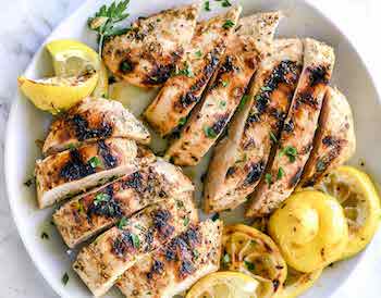 Marinate 1/2 kg boneless chicken cubes in: 1 tbs olive oil, 1 tsp minced garlic, 3 tbs fresh lemon juice, 3 tsp crushed black pepper, 1tsp dried oregano and salt.