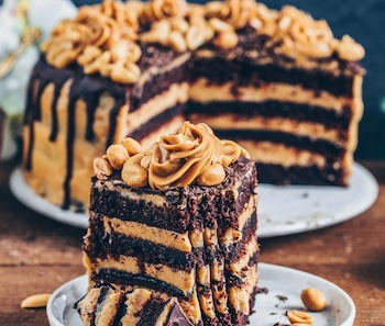 Crunchy filling, made with almonds, creamy peanut butter and chocolate. The silky milk-chocolate ganache frosting almost pushes the recipe over the top.