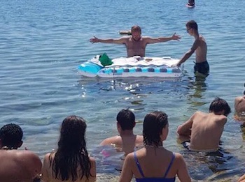 With no other shade available from the searing heat, a family nearby offered the use of the mattress and the priest took to the water, conducting the service with everyone – himself included – in swimsuits.