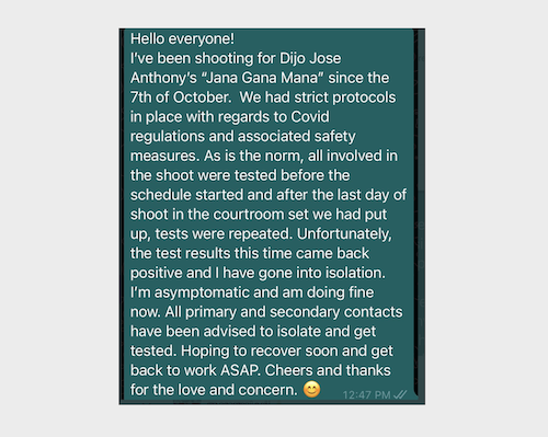 The government had given permission to conduct film shootings with 100 people or less on the sets, following safety protocols. Jana Gana Mana’s director Dijo Jose too has tested positive for Covid-19.