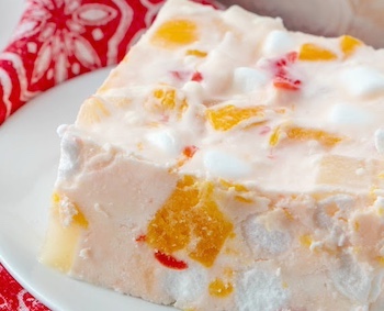 When the mixture is cool, add 1 pint of heavy cream whipped, chopped almonds, stale macaroon crumbles, 1 dozen marshmallows and 1 can of fruit salad.
