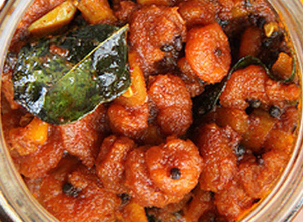 Marinate 2 kg king prawns in 3 tbs red chilli powder, 1 tsp turmeric powder and salt. Leave for an hour and then shallow fry the prawns in gingelly oil (The best for pickling, as it preserves the food longer)