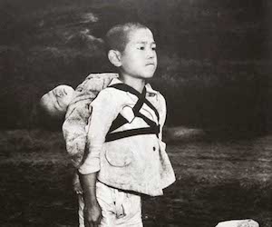 Suddenly a ragged little boy appeared. A baby was strapped in his harness. The baby who was his little brother, was dead. The little boy’s name was Akhiro Ueto. He was a sixth-grade student in a national school at the time the bomb hit. His mother had been sick and in bed. His brother was lying on his mother’s bed when the atomic bomb hit Nagasaki. The rays penetrated every cell of his younger brother and the infant later died.